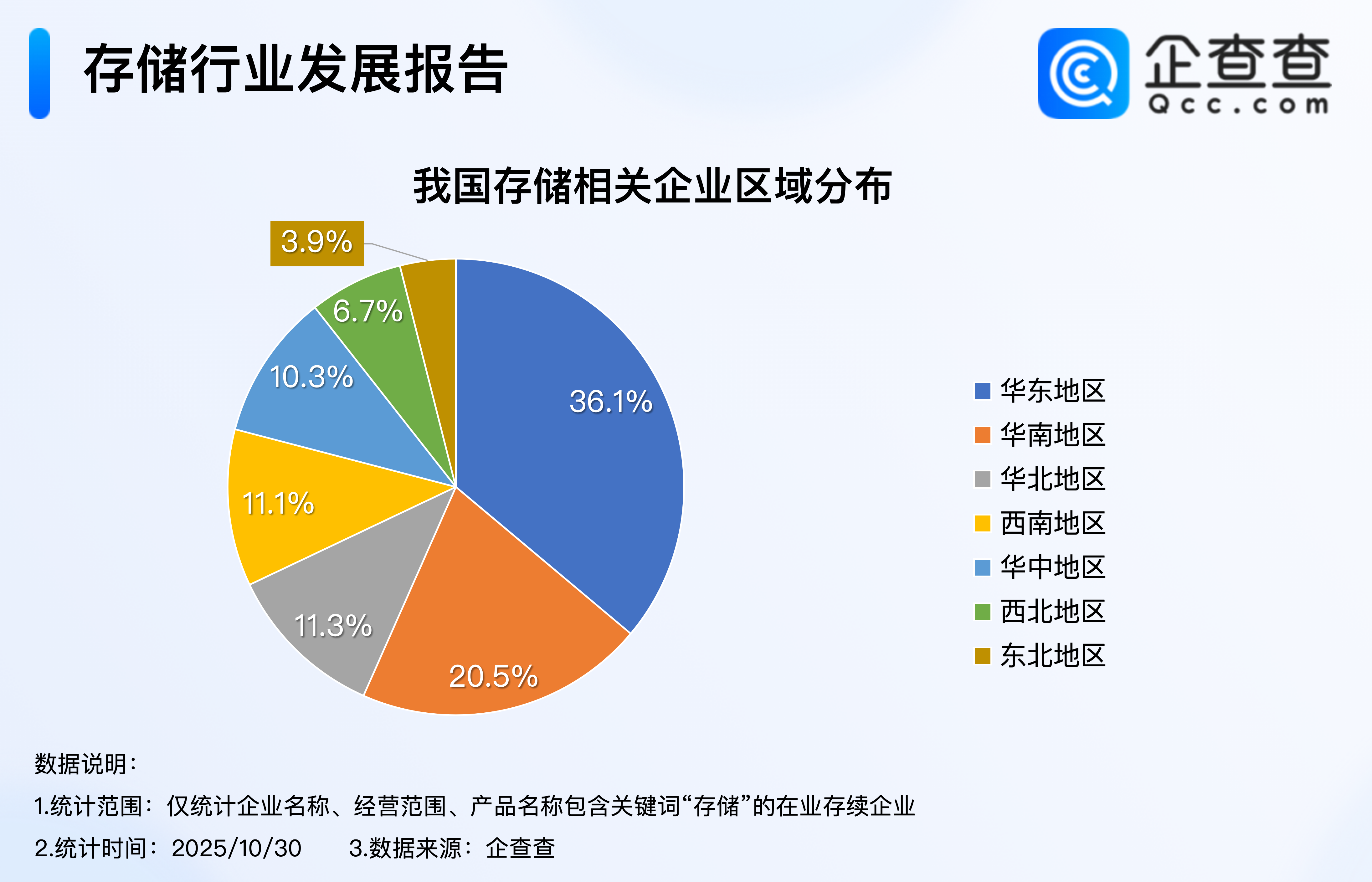 根据企查查数据,我国存储相关企业存量逐年稳步增加,分别于2020年、2024年首次突破50万家、100万家,截至2025年10月30日,我国存储相关企业存量超120万家,达120.5万家。3.从区域分布来看:华东最多,占比36%